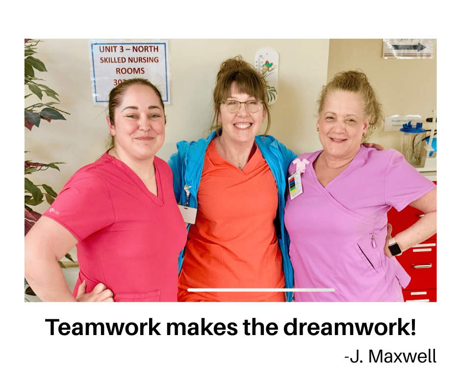 “When I first started working here, I couldn’t believe how welcoming and friendly the staff were. I enjoy working here because it really is one big team, and we all help each other and have fun doing it! It doesn’t feel like a sterile, clinical place. It is welcoming and people and residents here are wonderful!!” ~ Emily Godfrey, MNA
